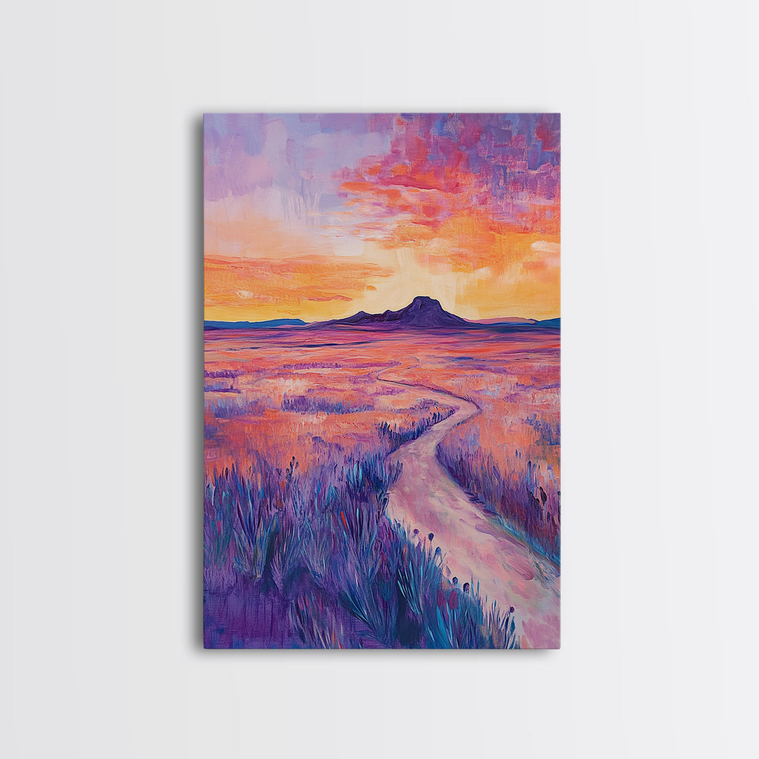 Desert Sunset Path Framed Canvas Print | Southwestern Landscape Art | Boho Wall Decor | Living Room Artwork | Warm Color Palette