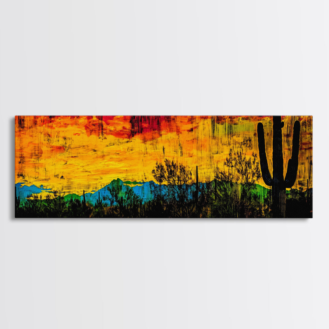 Desert Sunset, cactus painting, southwest wall art, coastal landscape art, framed canvas print, panoramic art