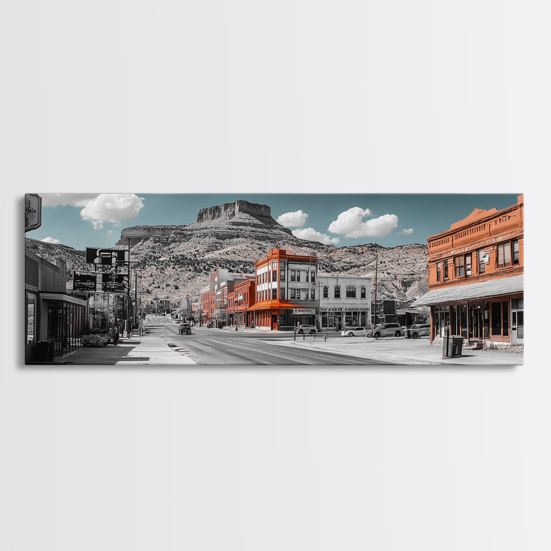 Desert Town Street, Vintage Western Shops, Mountain Scenic View, Retro Americana Vibe, Framed Canvas Print, Office Wall Art, Urban Decor