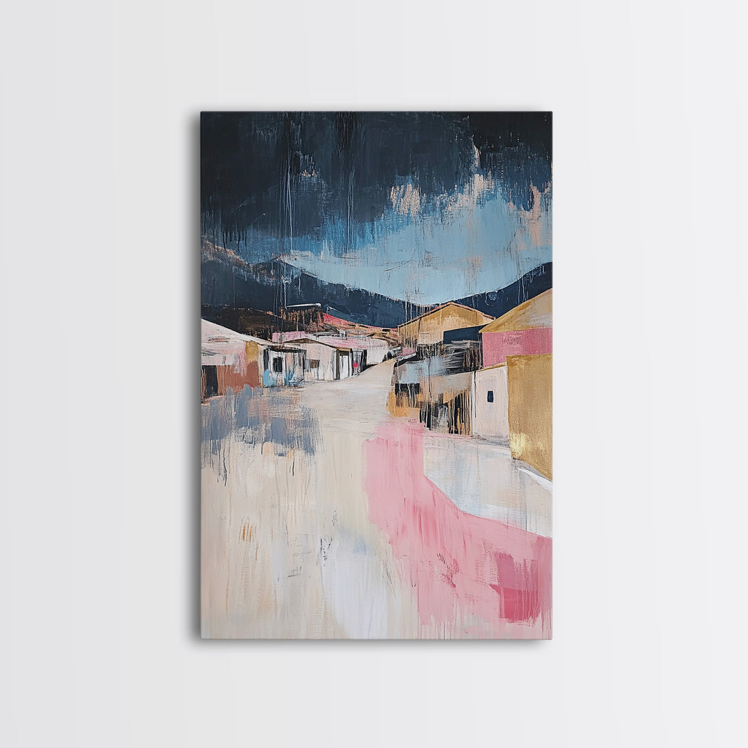 Desert Village, southwest wall art, moody art, warm tones, rustic decor, Joshua tree art, framed canvas print, abstract landscape