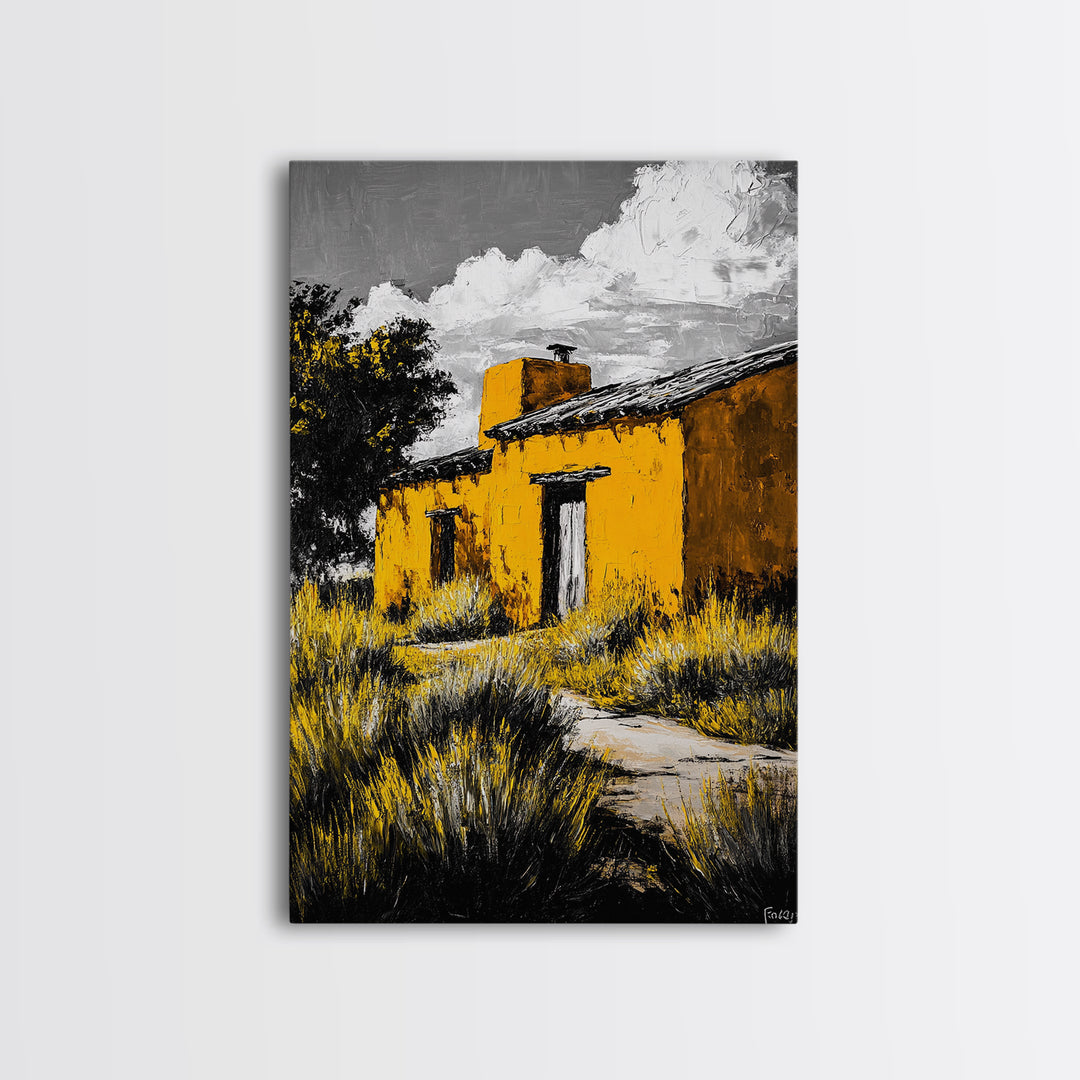 Desert Village, Southwestern Art, Yellow Landscape, Canvas Print, Rustic Wall Decor, Living Room Wall Art, Modern Abstract, Boho Aesthetic
