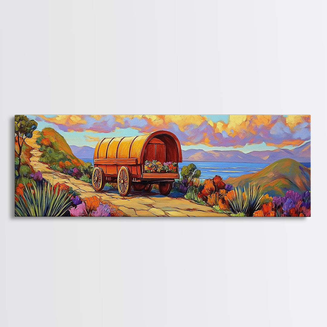 Desert Wagon, rustic western art, cowboy decor, boho wagon painting, farmhouse wall art, extra wide panoramic art, framed canvas print