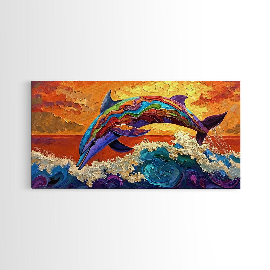 Dolphin Waves, Sunset, Colorful Ocean Animal Canvas Print, Playful Marine Wall Art, Coastal Boho Decor, Kids Room Artwork