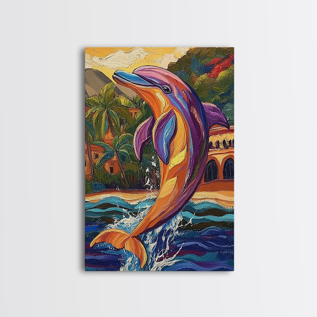 Dolphin Splash, Ocean Wildlife, Framed Canvas Print, Colorful Wall Art, Beach House Decor, Living Room Art, Vibrant Sea Life Painting