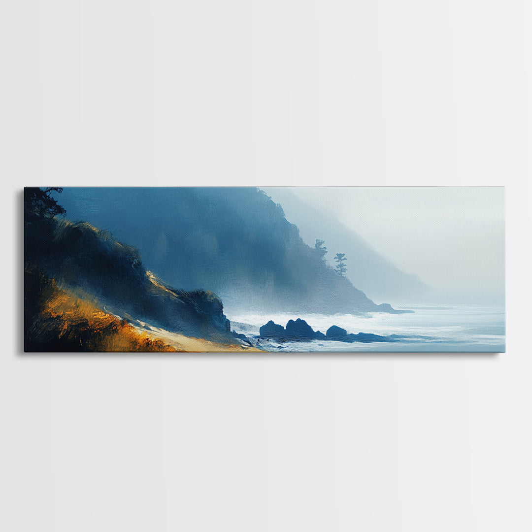 Dramatic Coastline Canvas Print Moody Seaside Painting, Stormy Ocean Landscape, Dark Blue Beach Wall Art, Living Room Decor