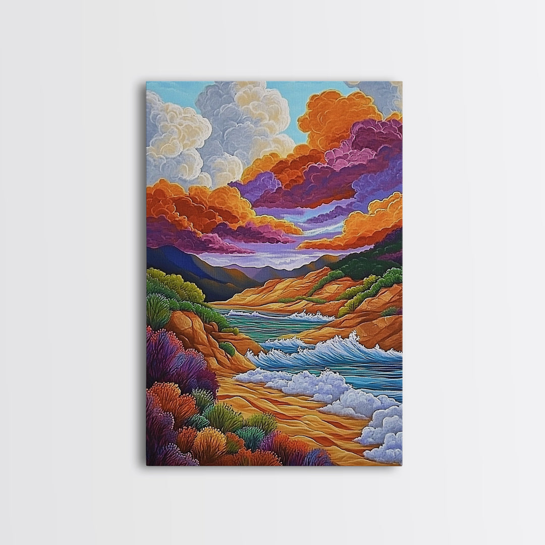 Dramatic Sky, Ocean Hills, Coastal Magic, Colorful Clouds, Framed Canvas Print, living room coastal decor, vibrant nature art, boho fall