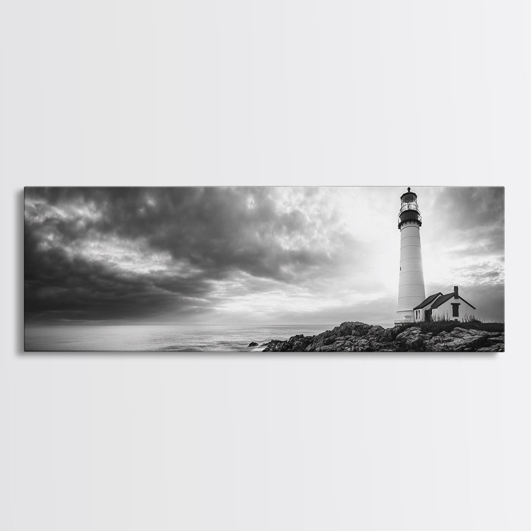 Dramatic Lighthouse Coast, Ocean Storm Horizon, Coastal Adventure, Framed Canvas Print, Living Room Wall Art, Nautical Fall Decor