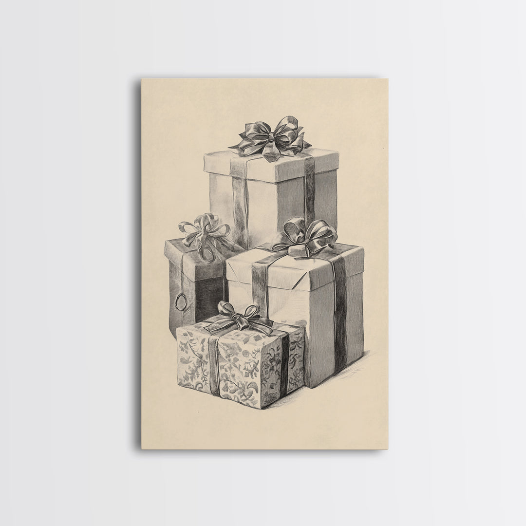 Drawing of Christmas Gifts Canvas Print - Framed Canvas - Minimalist Christmas Art - Boho Christmas Art - Rustic Christmas Art
