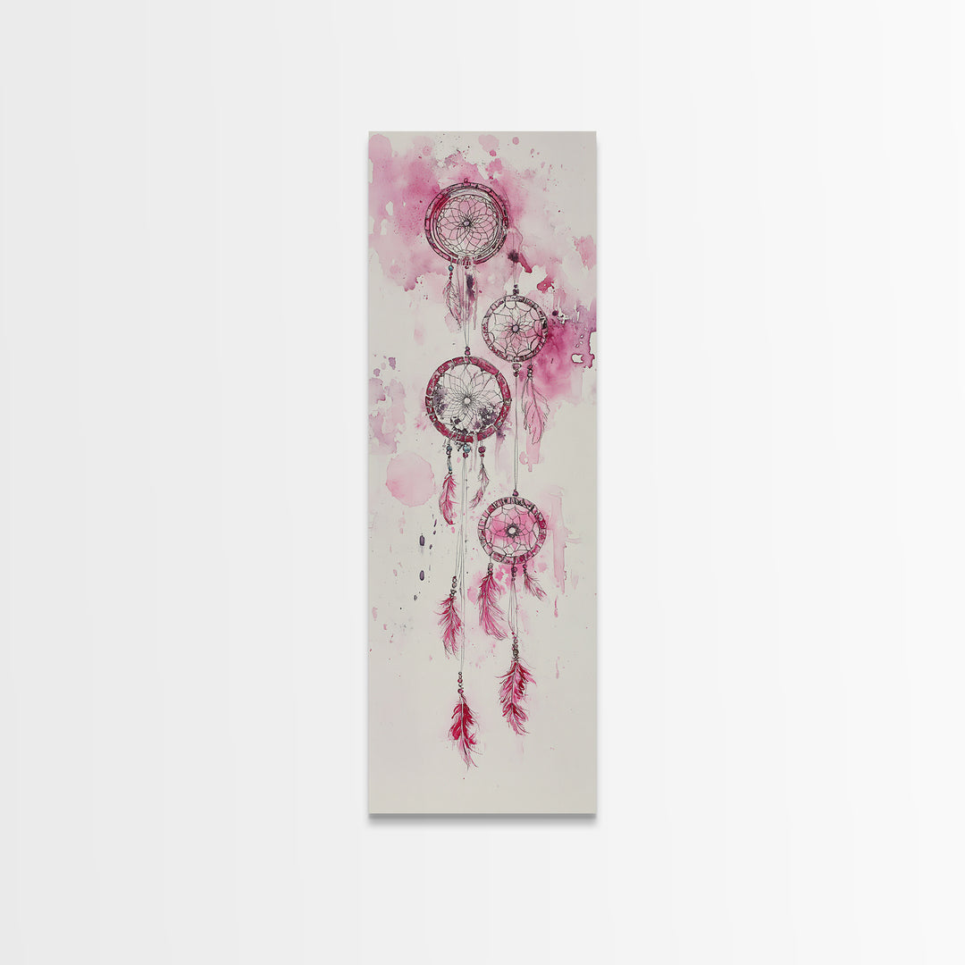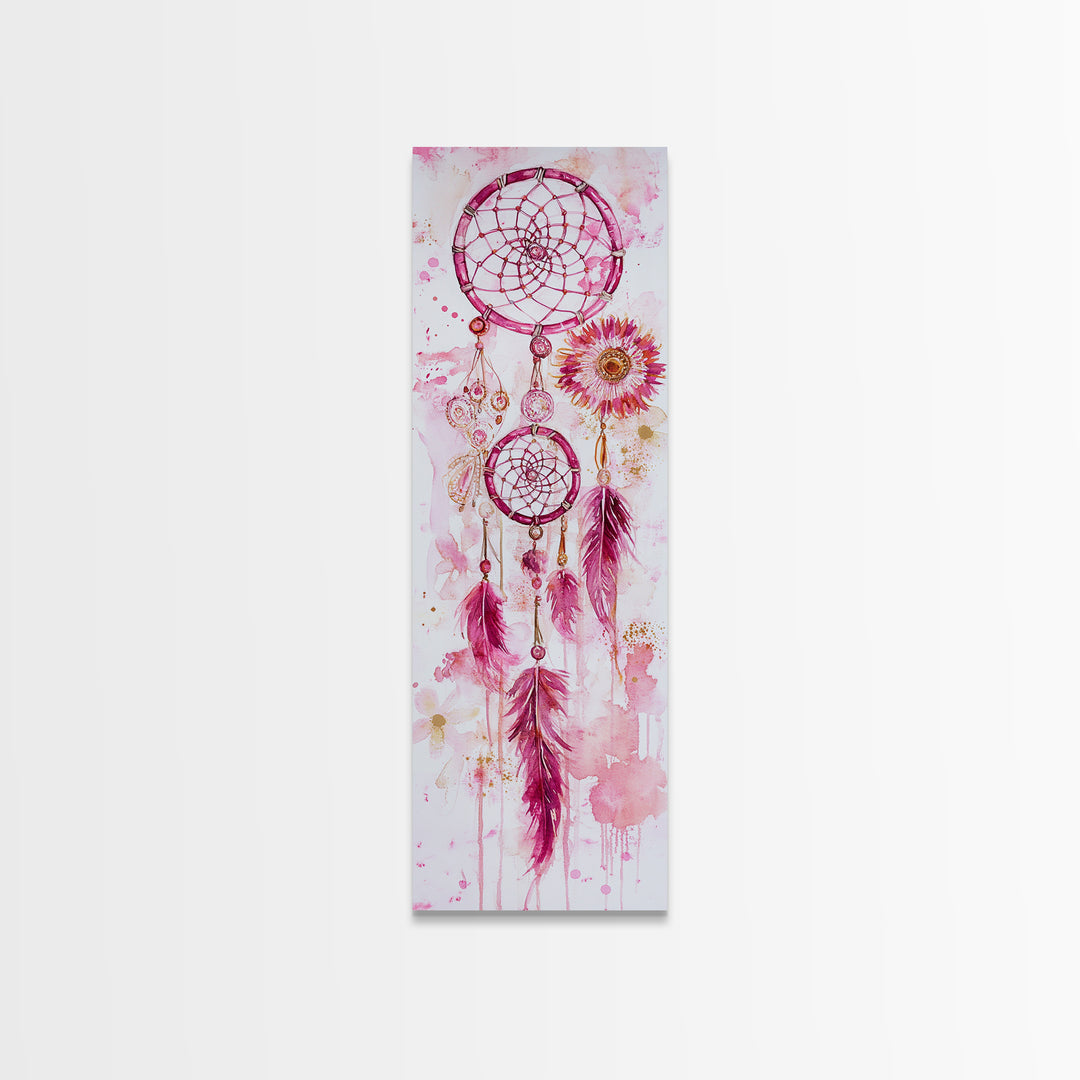 Dreamcatcher Pink Feathers Framed Canvas Print Boho Wall Art Minimalist Long Narrow Art Bedroom Decor Vertical Dorm Wall Art