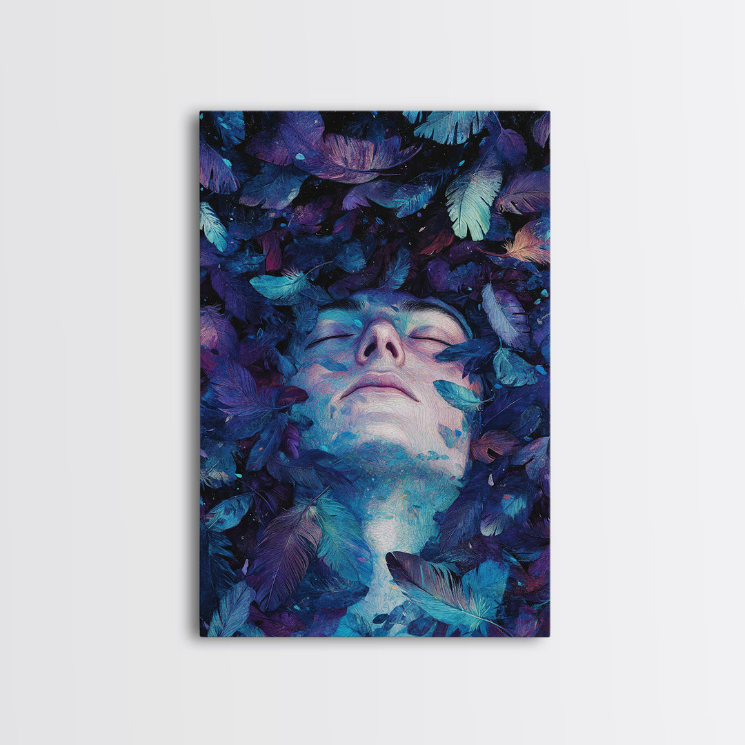 Dreamy Blue Feathers Canvas Print | Ethereal Surreal Art | Boho Bedroom Decor | Unique Abstract Painting | Cosmic Wall Art