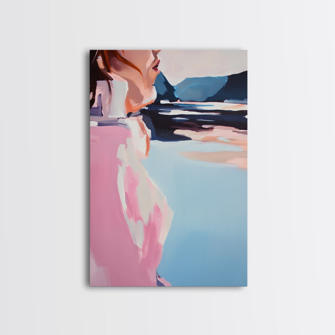 Dreamy Beach Art, Minimalist Woman Portrait, Coastal Fashion Illustration, Soft Pastel Colors, Framed Canvas Print, Bedroom Wall Art