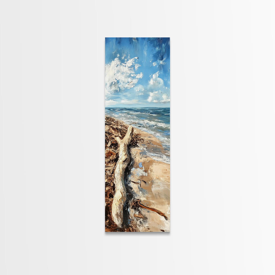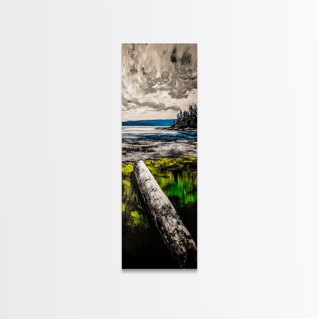 Drifting Log, rustic art, coastal painting, seascape painting, panoramic art, landscape painting, Framed Canvas Print,