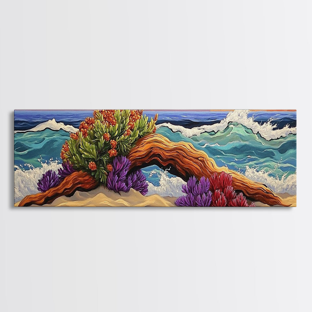 Driftwood Coast, Colorful Ocean, Beach Nature, Framed Canvas Print, Coastal Wall Art, Tropical Living Room Decor, Surreal Seascape Art