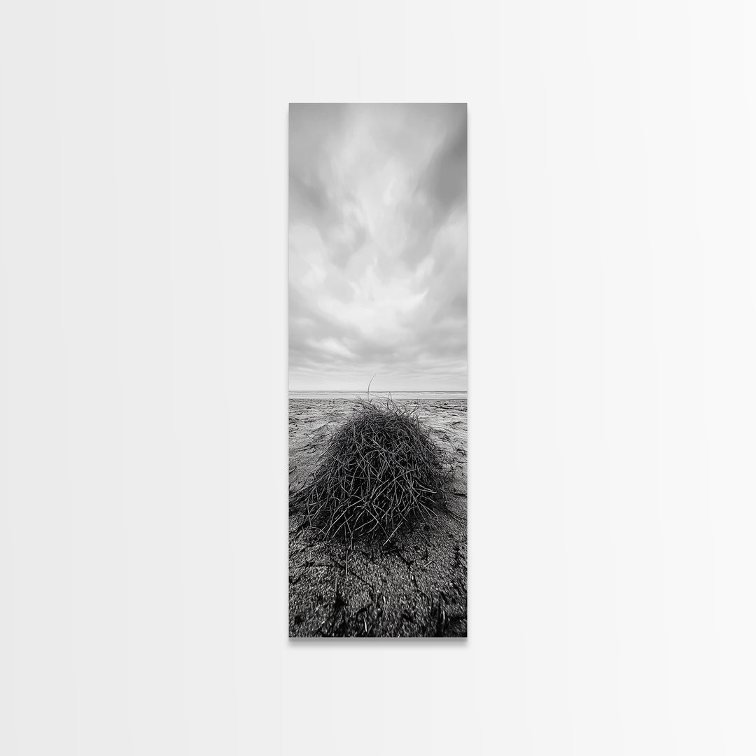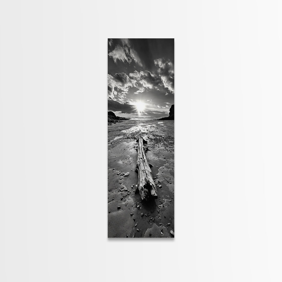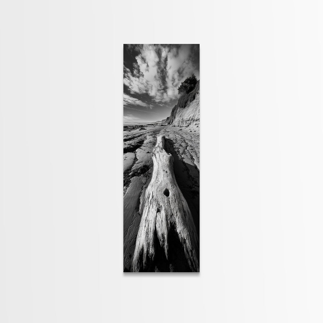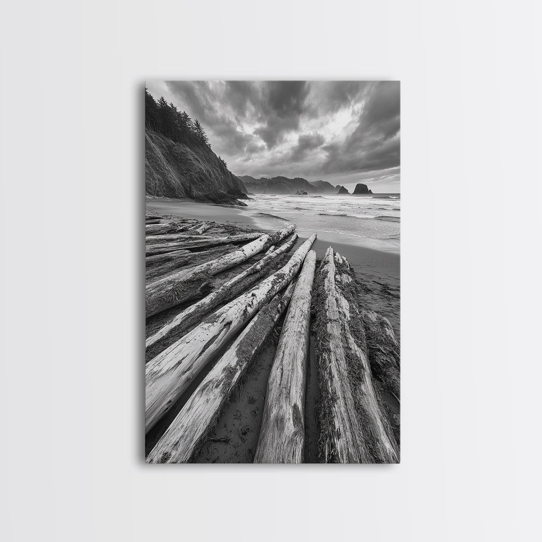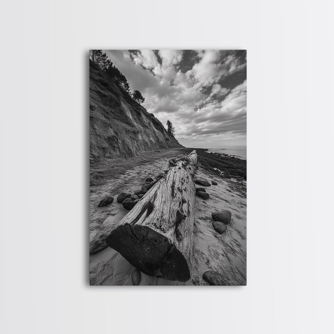 Driftwood Beach, Coastal Landscape, Framed Canvas Print, Black and White Wall Art, Nature Photography Style, Serene Home Decor, Bedroom Art