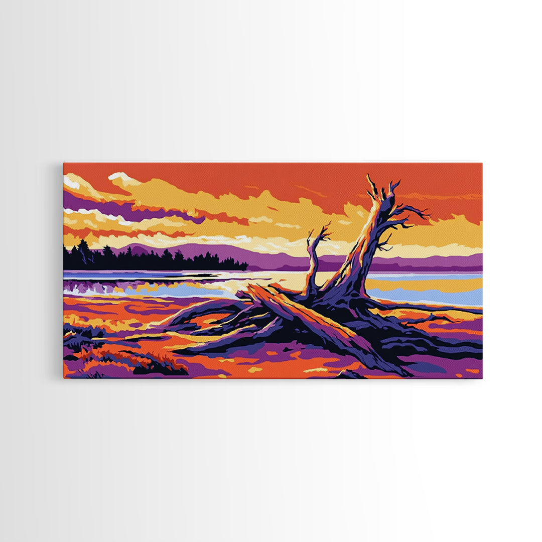 Driftwood Beach Scene, coastal landscape art, nautical painting, rustic wall art, ocean sunset art, panoramic art, framed canvas print