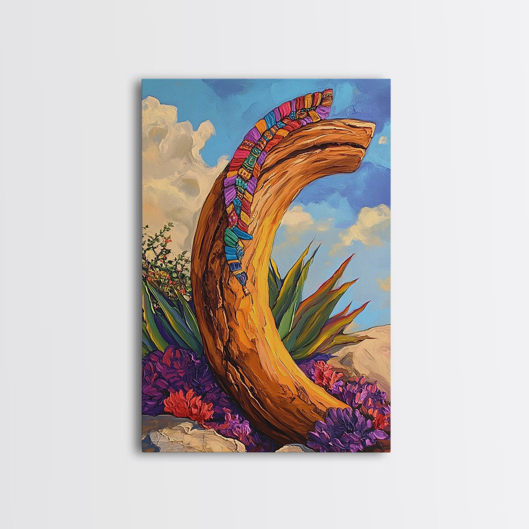 Driftwood, Woven Textile, Desert Sky, Framed Canvas Print, rustic wall art, southwest decor, colorful boho style, Entryway Wall Art