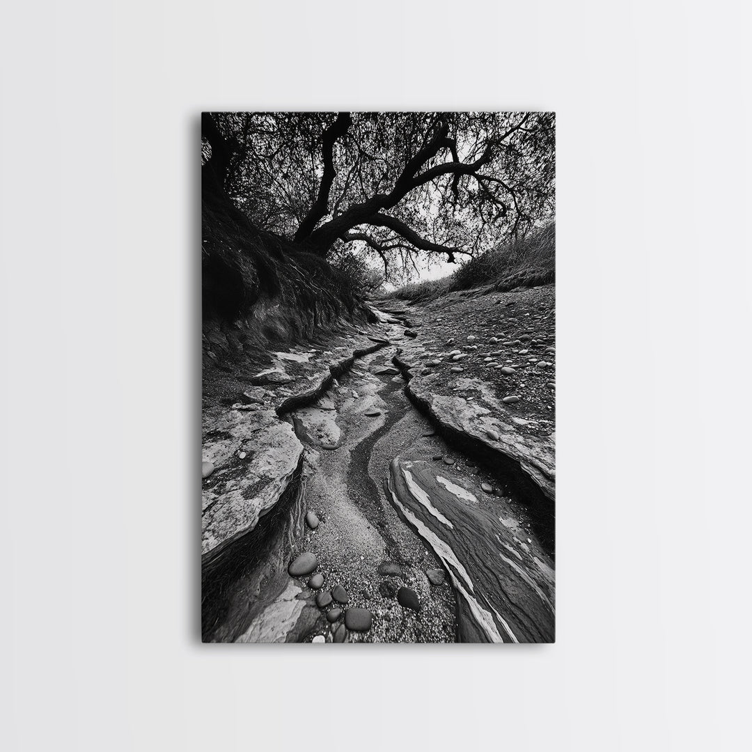 Dry Creek, Twisted Tree, Rocky Path, Framed Canvas Print, Moody Autumn Wall Art, Earthy Entryway Decor, Nature Texture Photography