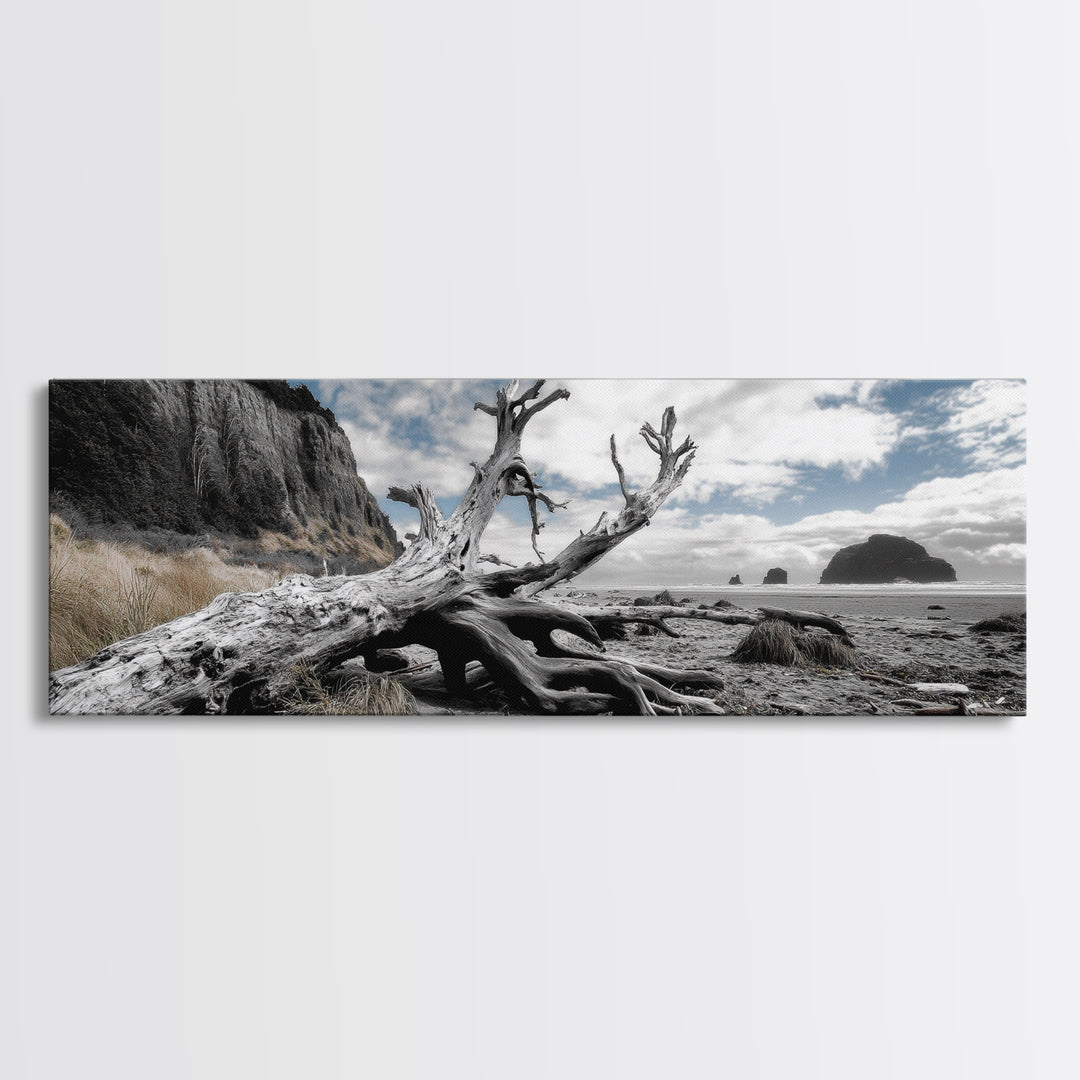 Driftwood, Coastal Tree, Beach Skeleton, Ocean Landscape, Framed Canvas Print, Coastal Decor, Neutral Tones, Office Wall Art