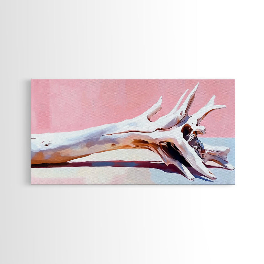 Driftwood, wabi sabi art, rustic decor, framed canvas print, minimalistic art, light pink wall art, extra wide art, boho art
