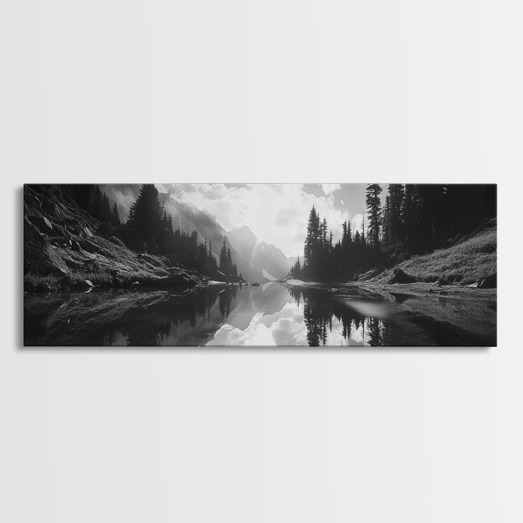 Alpine Lake Scene, Black and White Forest, Serene Mountain Print, Framed Canvas Print, Rustic Wall Art, Cabin Living Room Decor