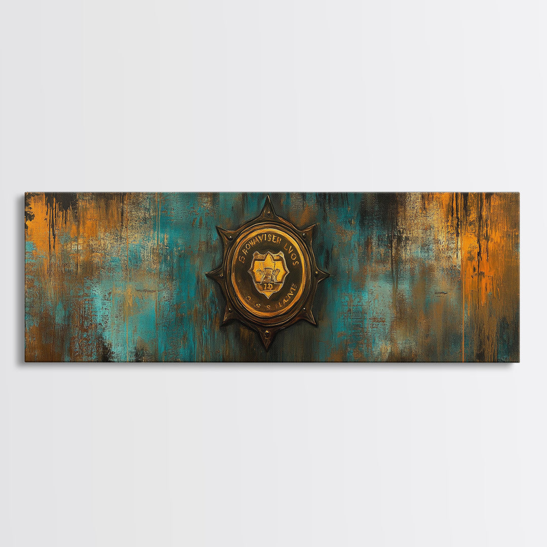 Antique Badge Canvas Print Vintage Industrial Wall Art, Rustic Home Decor, Distressed Metal Artwork, Man Cave Aesthetic