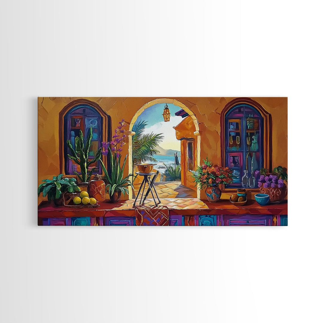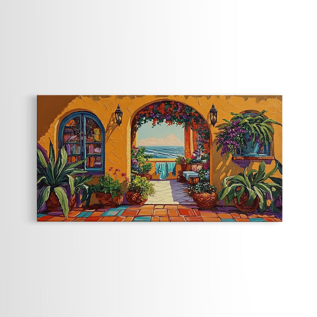 Archway View, Ocean, Spanish Style, Framed Canvas Print, Colorful seaside escape scene ideal Bathroom Wall Art or Tropical Kitchen Decor