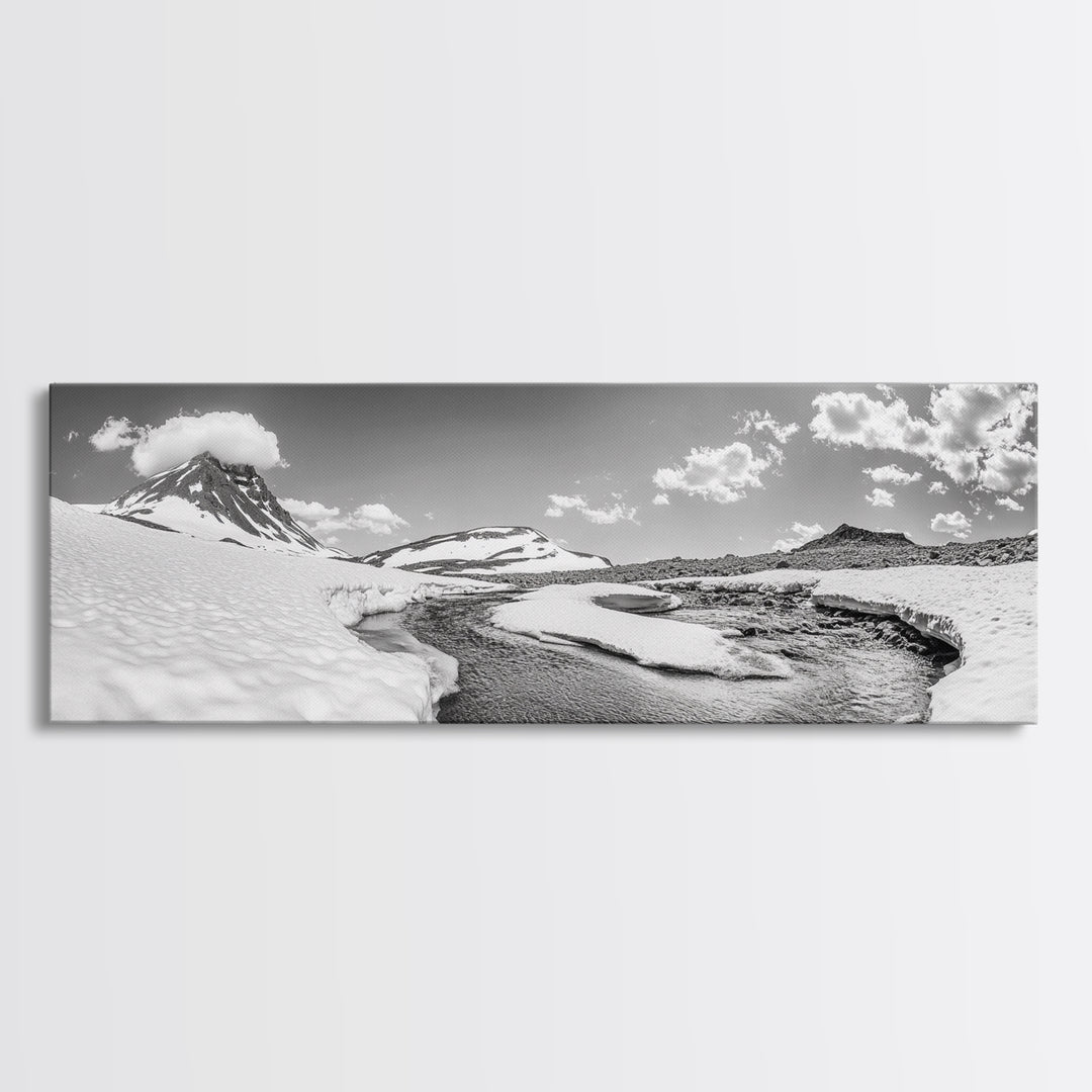 Arctic River, Snowy Mountains, Glacier Melt, Framed Canvas Print, Winter Landscape Art, Modern Living Room Decor, Nordic Aesthetic