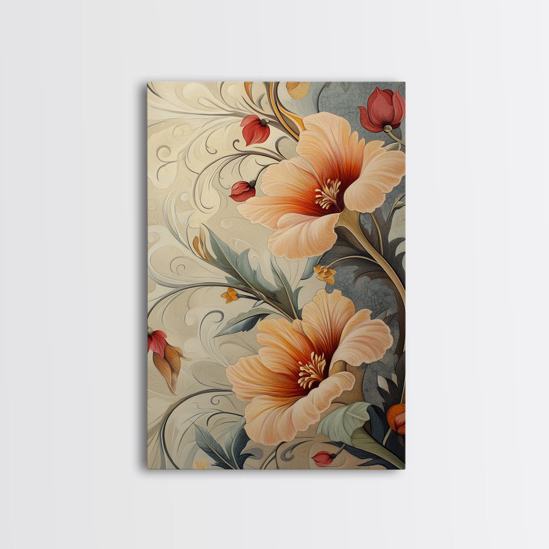 Art Nouveau Floral Framed Canvas Print Vintage Botanical Prints Pastel Orange Wildflower Gift Idea Bedroom Rustic Wall Art Boho Decor