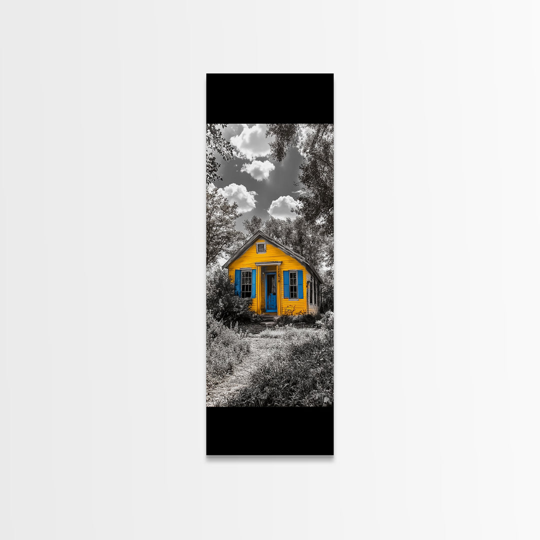 Abandoned Cottage, Blue Shutters, Yellow House, Framed Canvas Print, Rustic Home Decor, Vintage Aesthetic, Halloween Wall Art, Living Room Art