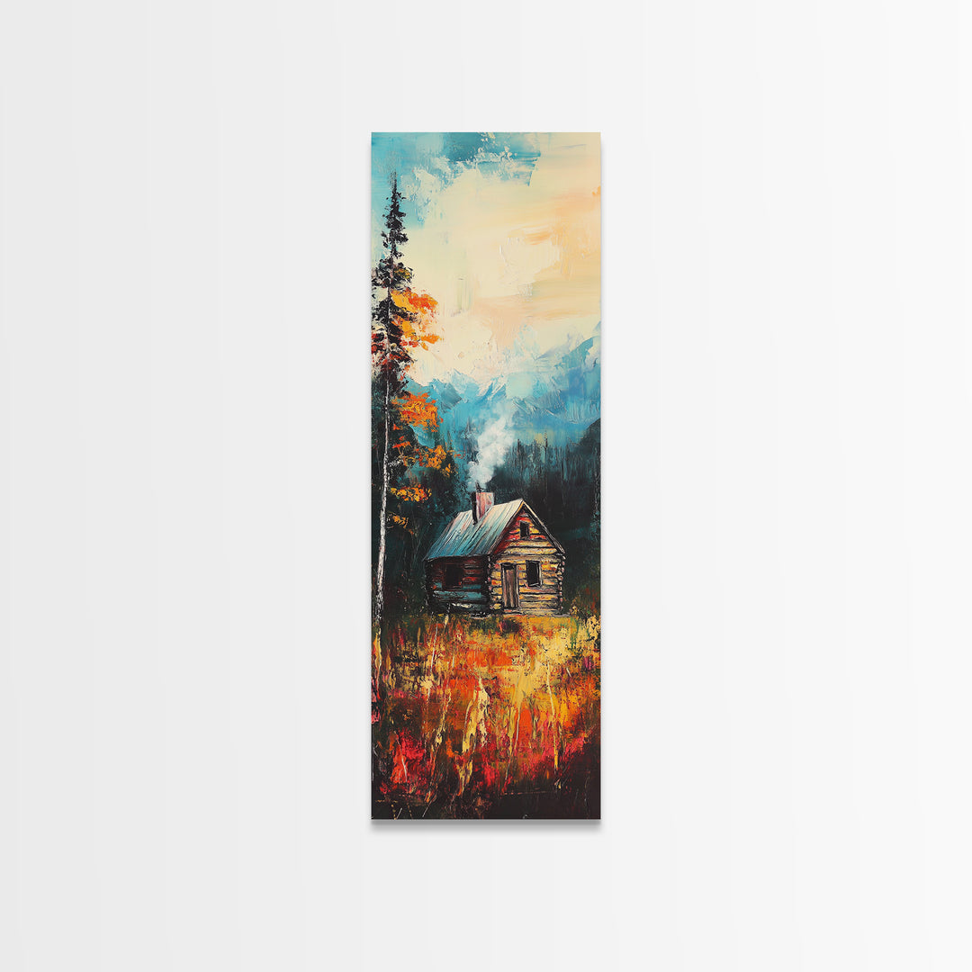 Autumn Cabin, rustic decor, vintage Christmas, farmhouse art, wabi sabi art, moody art, mountain painting, Framed Canvas Print