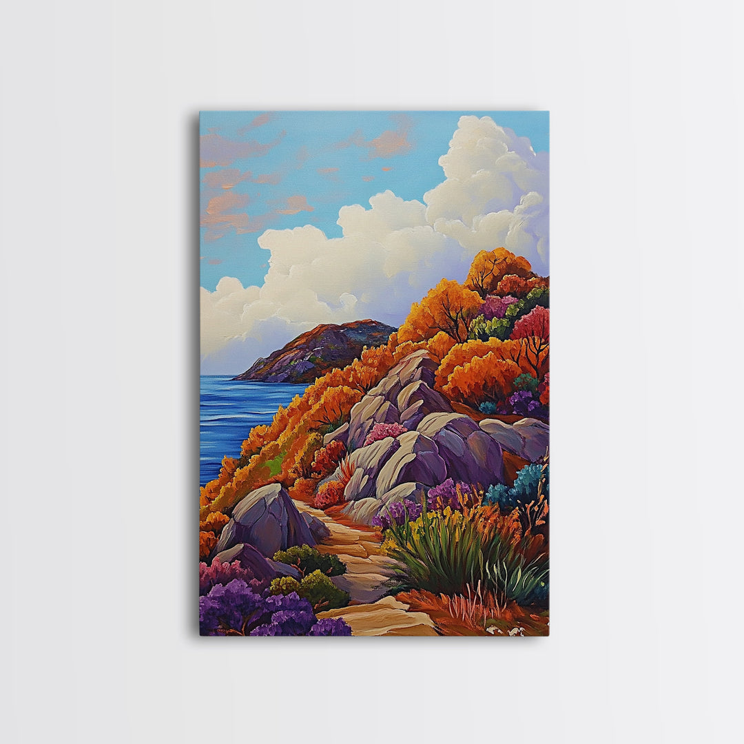 Autumn Cliffside, Trail, Ocean, Framed Canvas Print, fall coastal landscape, boho mountain decor, bold colors, seasonal Living Room art