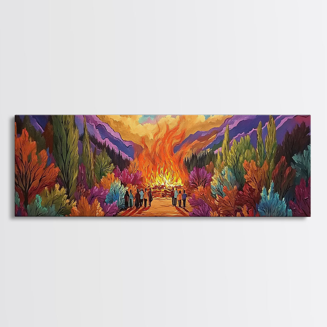 Autumn Bonfire Gathering, Vibrant Landscape, Colorful Fall Forest, Framed Canvas Print, Cabin Decor, Rustic Wall Art, Cozy Fall Art