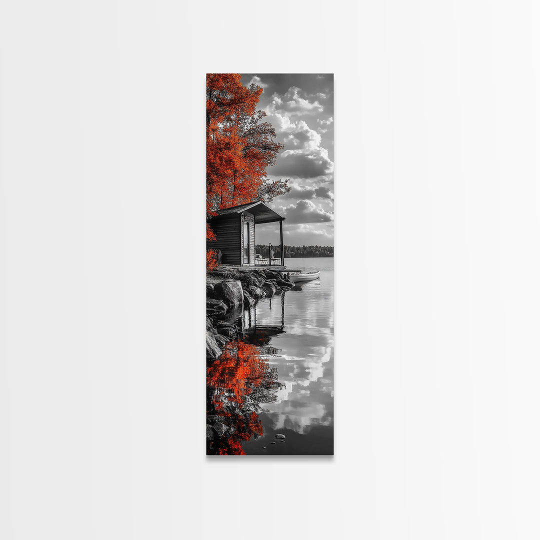 Autumn Cabin Lake, Red Tree Reflections, Tranquil Retreat, Rustic Getaway, Framed Canvas Print, Fall Decor, Nature Wall Art, Lodge Style