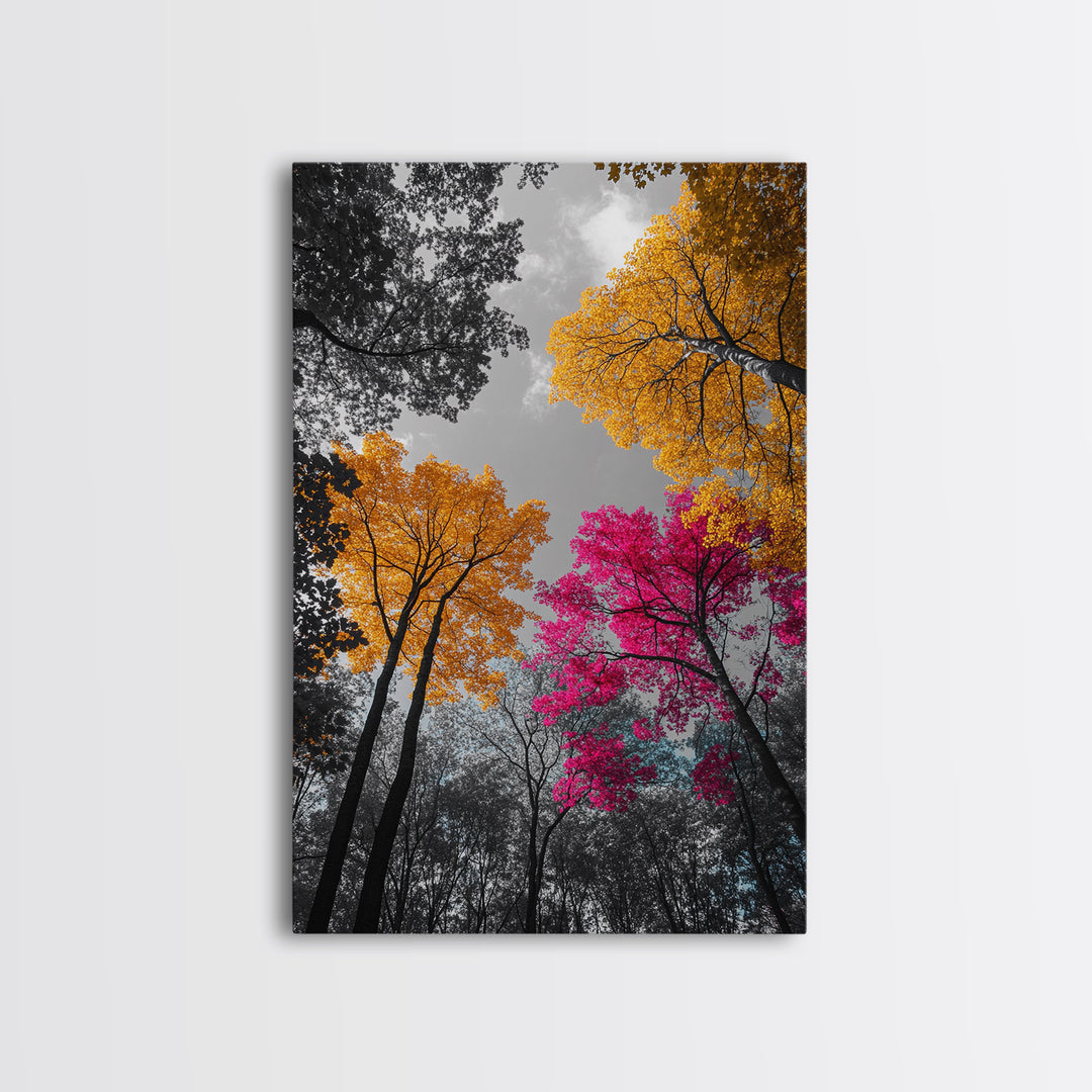 Autumn Canopy, Colorful Trees, Pink and Gold Leaves, Forest Sky, Framed Canvas Print, Boho Fall Wall Art, Whimsical Nature Decor