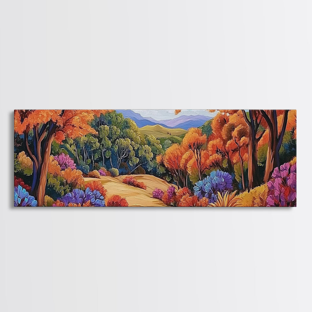 Autumn Forest Path, Bold Mountain Horizon, Colorful Nature Painting, Framed Canvas Print, Fall Living Room or Entryway Wall Decor