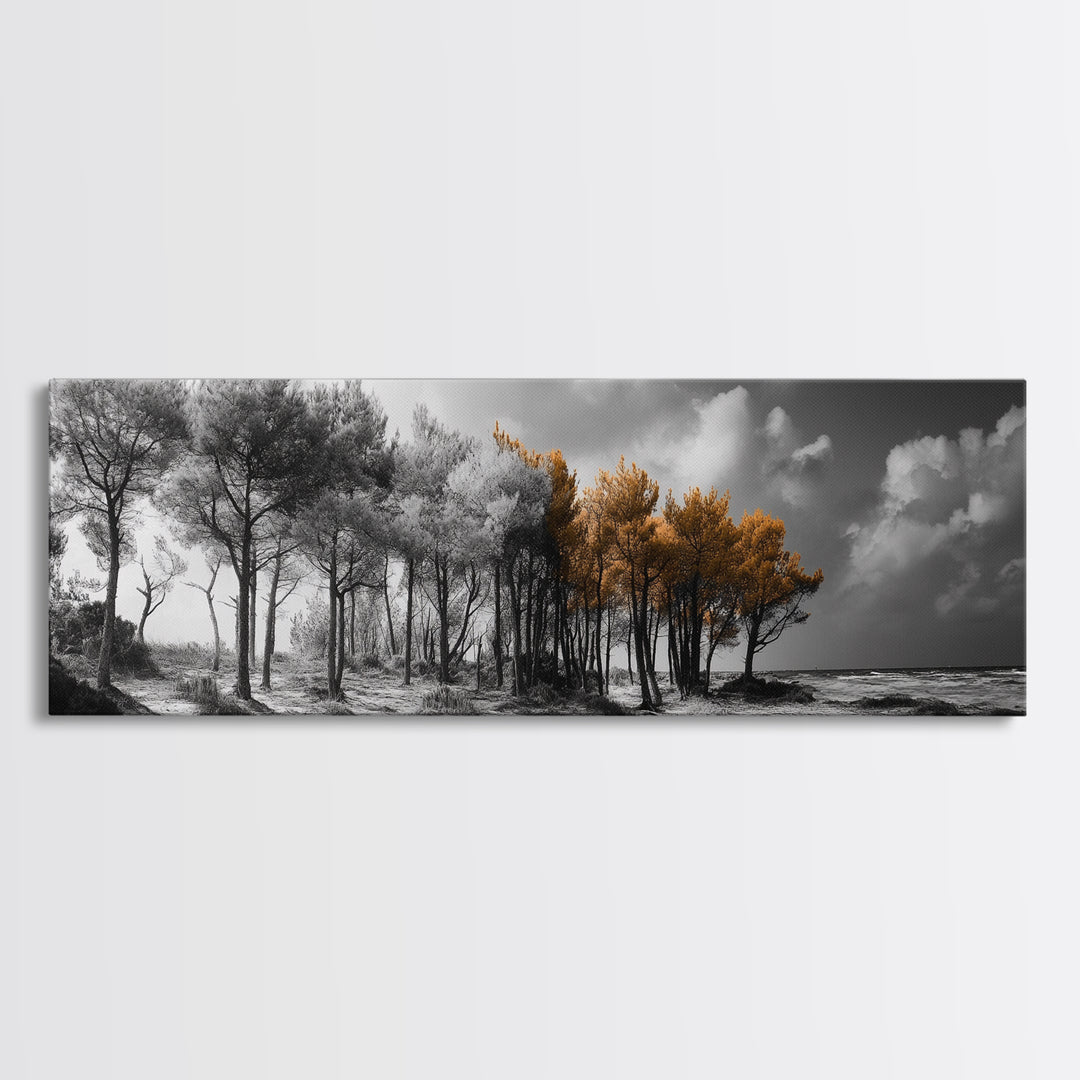 Autumn Forest Trees, Windswept Pine Grove, Beachside View, Framed Canvas Print, Fall Wall Art, Entryway Decor, Minimalist Style