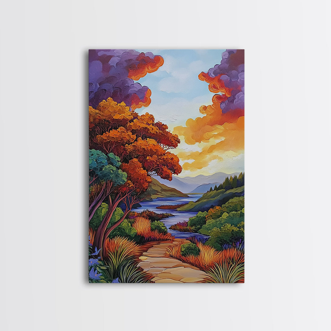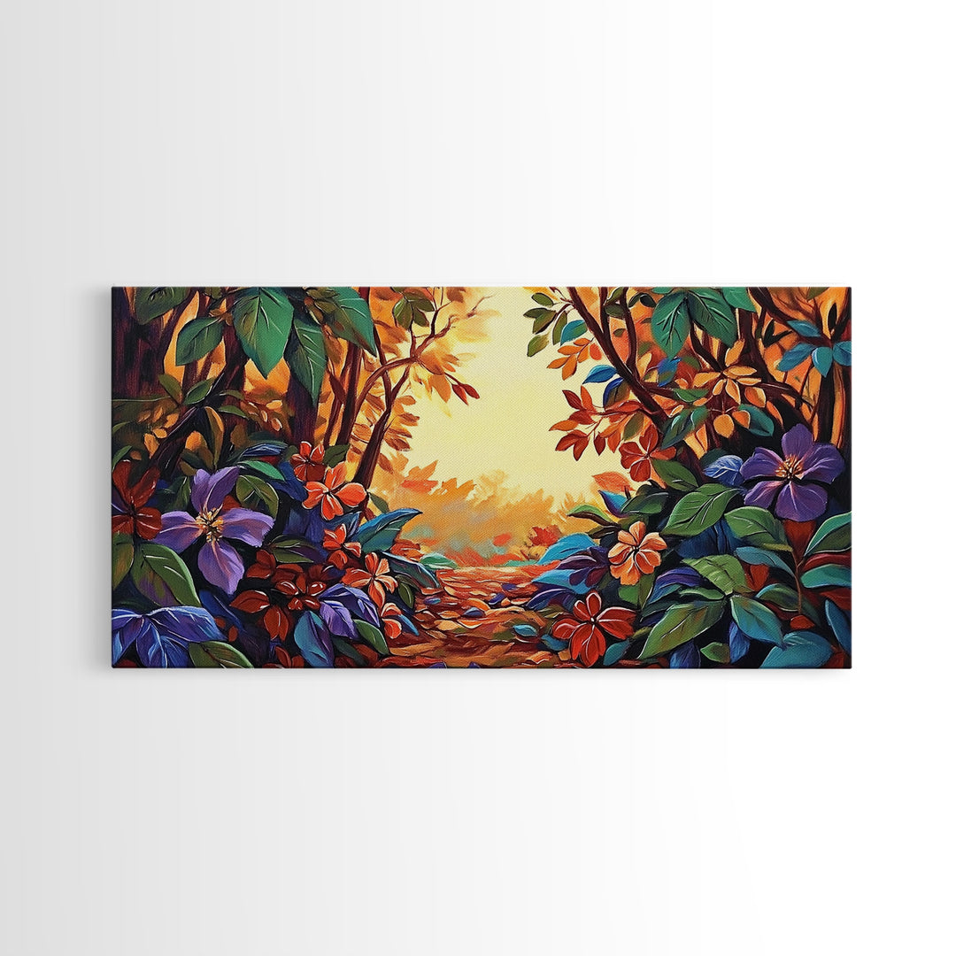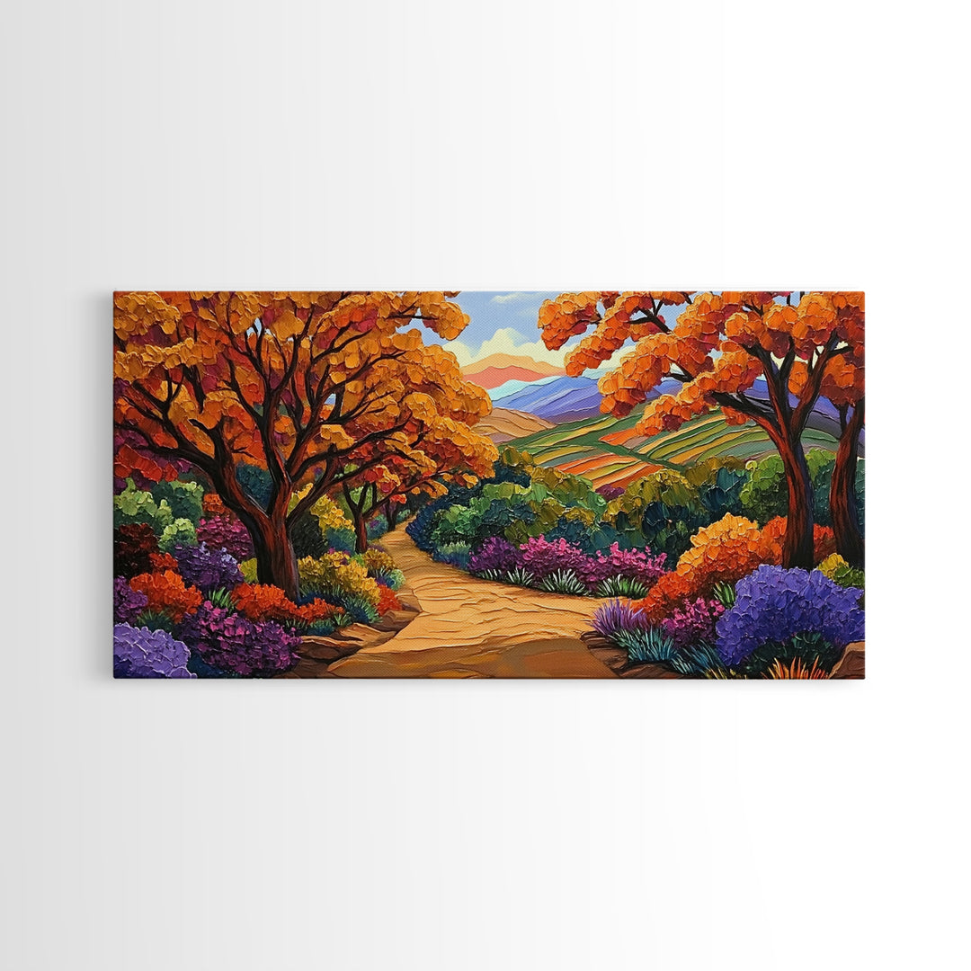 Autumn Forest, Trail, Path, Framed Canvas Print, vibrant landscape painting, colorful fall decor, living room wall art, boho style