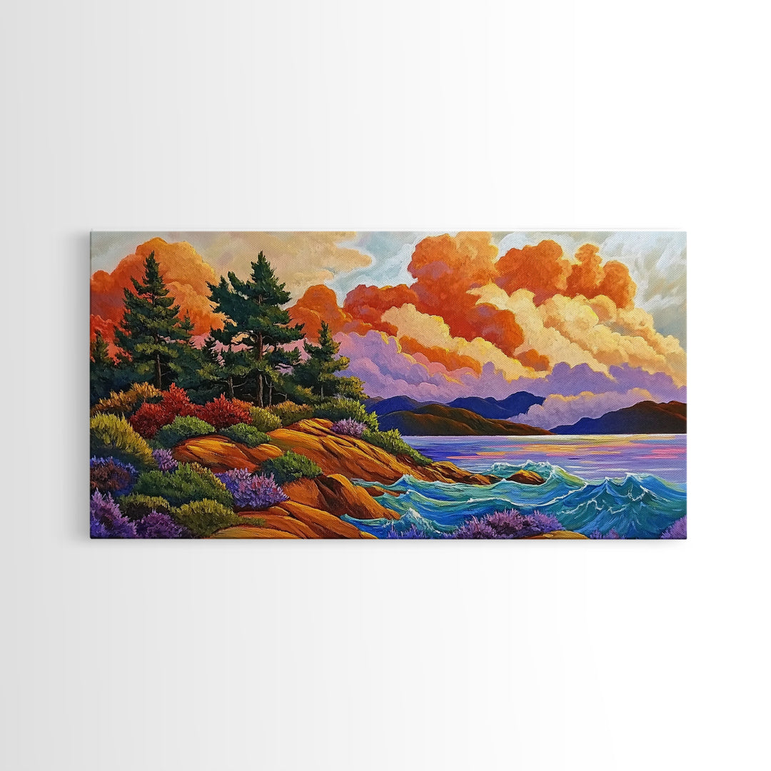 Autumn Lake, Pines, Colorful nature landscape with pine trees and rocky lake shoreline, Canvas Print, Fall cabin wall decor, lodge art