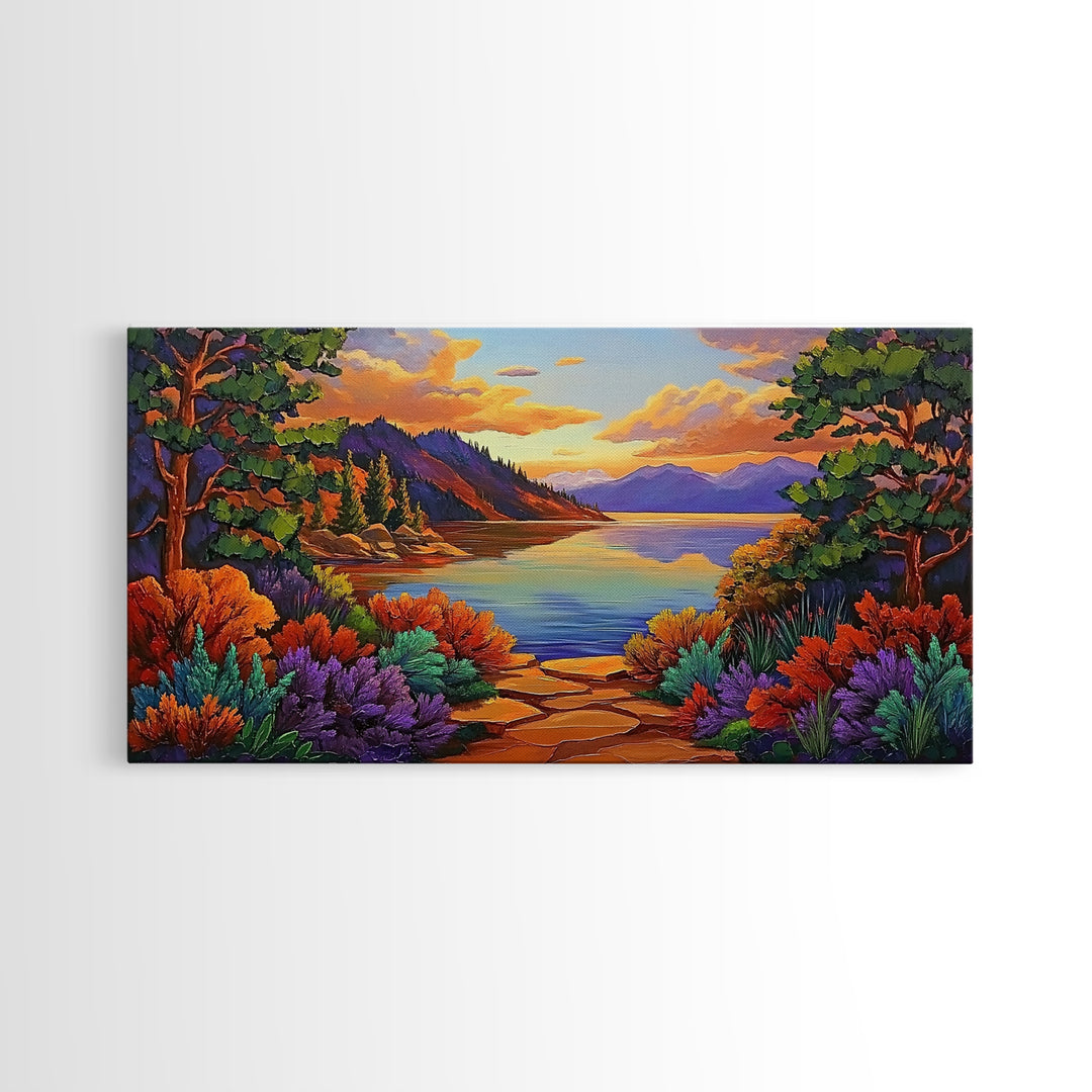 Autumn Lake, Trail, Fall Landscape Painting, Warm Sunset Wall Decor, Living Room Boho Vibes, Framed Canvas Print