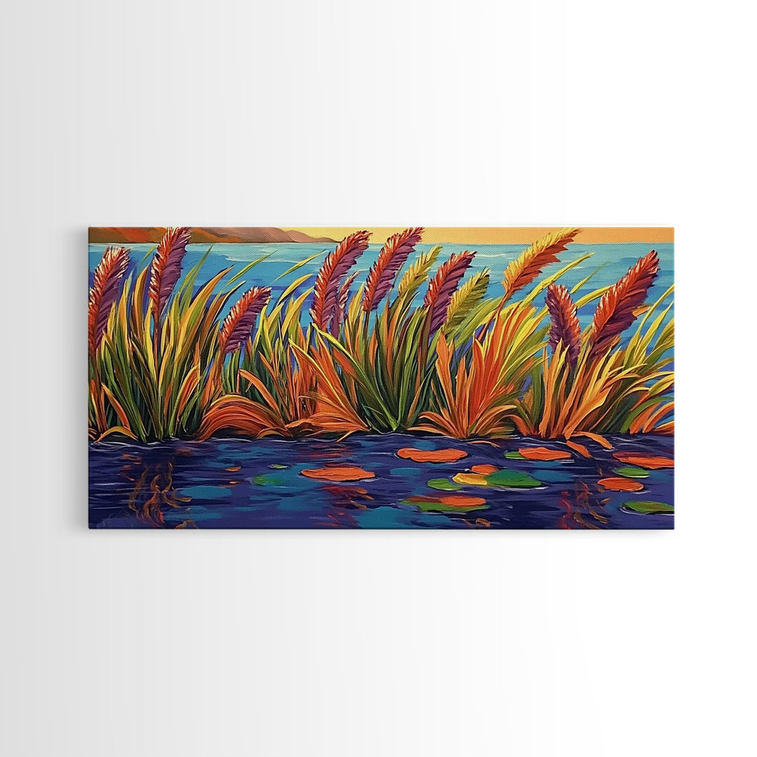 Autumn Lakeside, Grasses, Art, Framed Canvas Print, Fall coastal reed painting, rustic harvest decor, nature print, living room wall