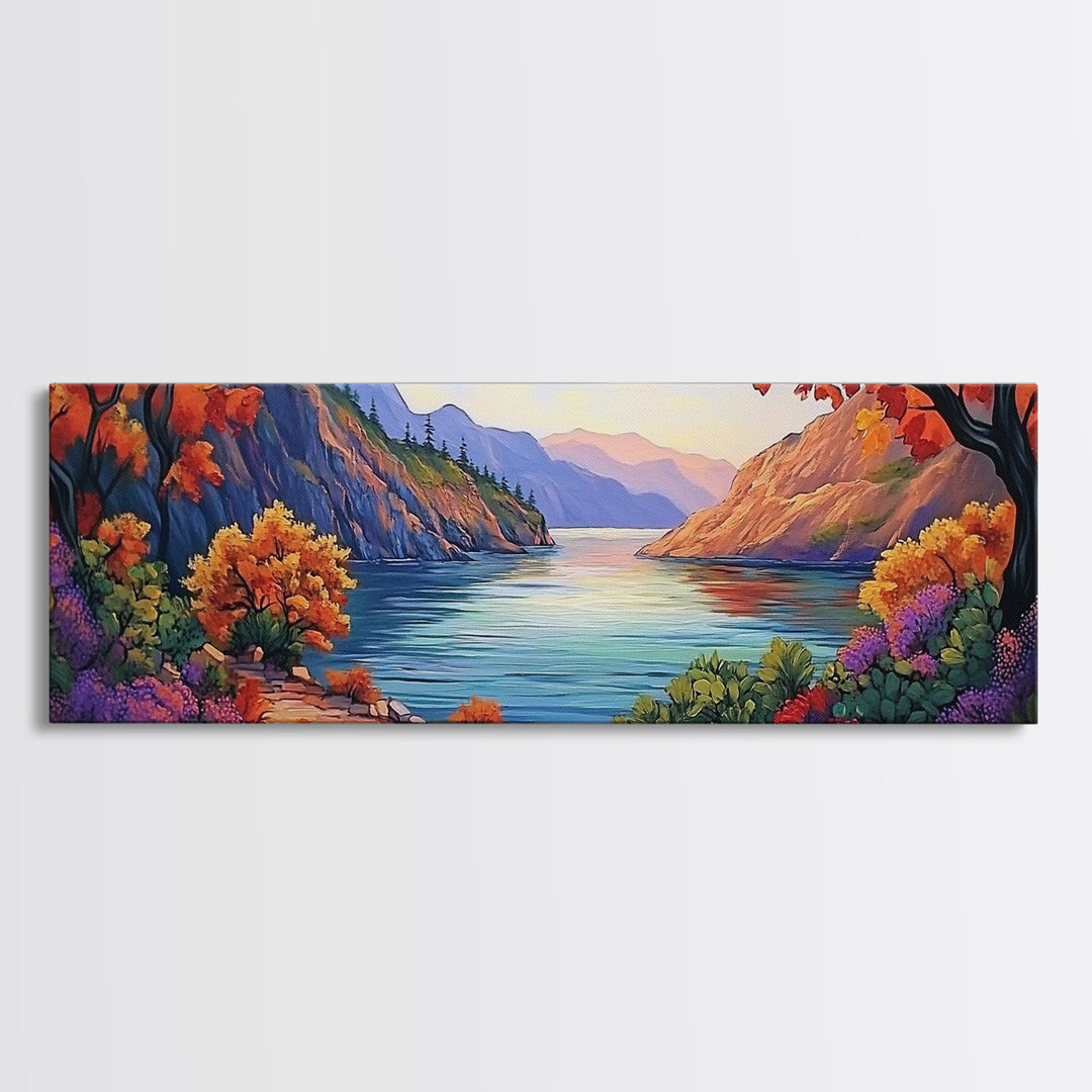 Autumn Lake, Mountain View, Colorful Trees, Tranquil Nature, Framed Canvas Print, Fall Wall Art, Living Room Decor, Cozy Forest Landscape