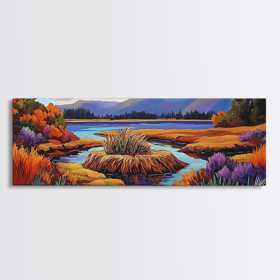 Autumn Lake Scene, landscape painting, fall wall art, framed canvas print, rustic decor, above sofa art, moody art, extra wide art