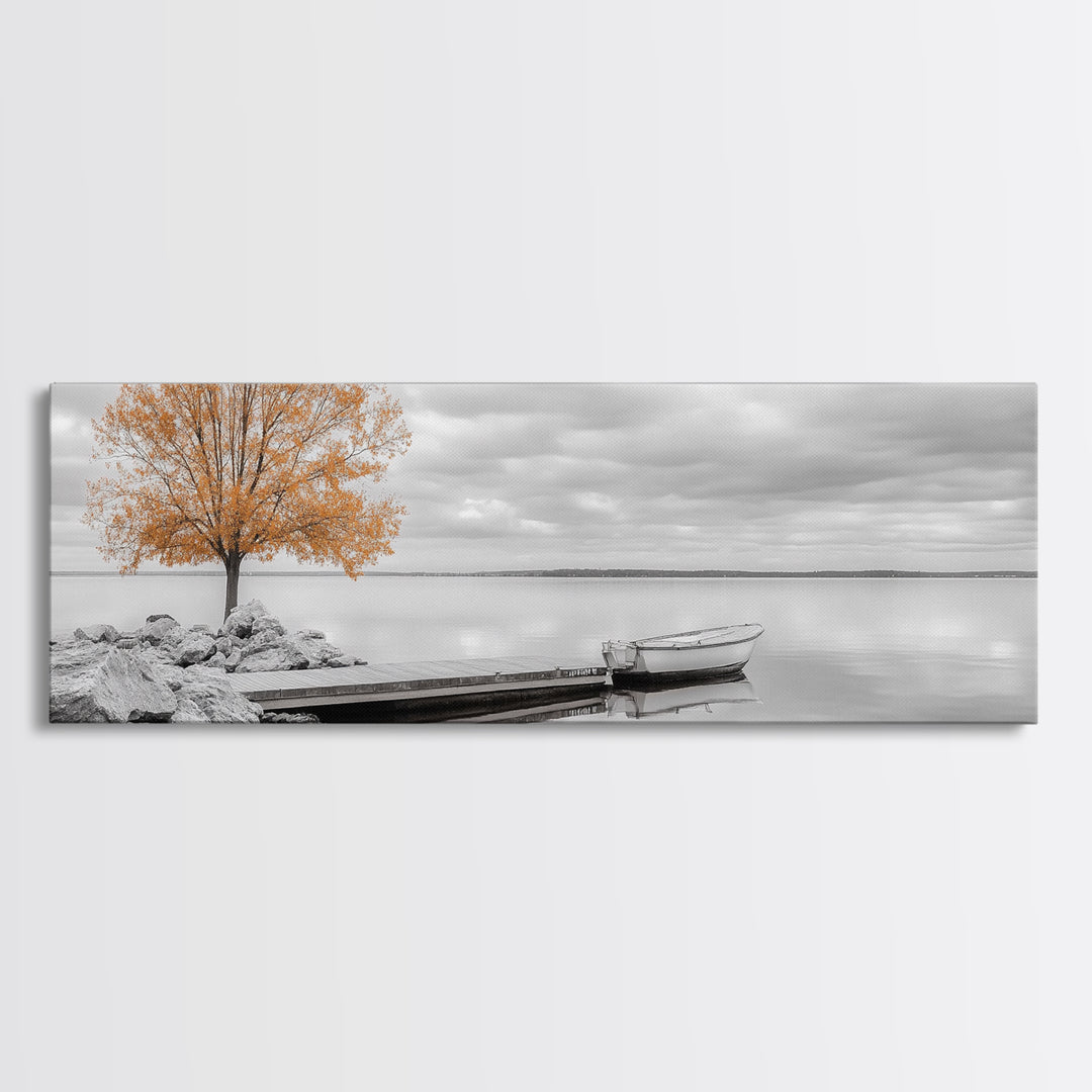 Autumn Lake Tree, Calm Dock, Boat Still Waters, Framed Canvas Print, Neutral Fall Colors, Minimalist Art, Bedroom Wall Decor, Serene Scene