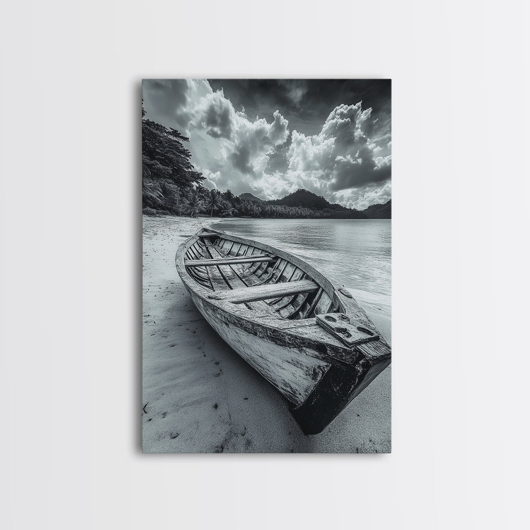 Abandoned Rowboat, Tropical Coastline, Vintage Travel Vibes, Black and White Canvas Print, Beach House or Coastal Living Wall Art