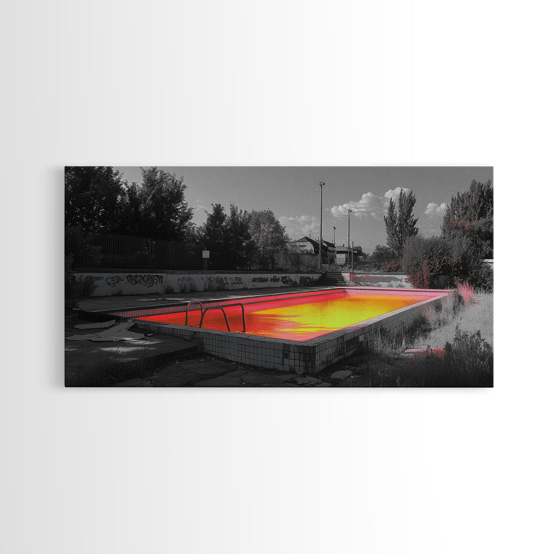 Abandoned Pool, Neon Water, Urban Decay, Vivid Glow, Canvas Print, Grunge Wall Art, Teen Bedroom Decor, Street Photography, Color Pop
