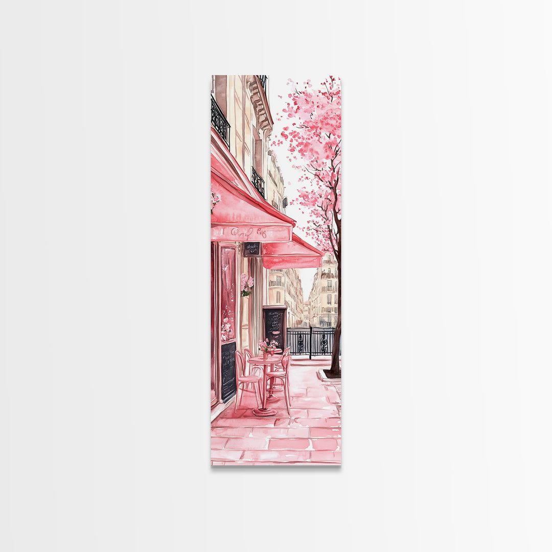 Paris Café Scene Canvas Print Cherry Blossom Painting Above Sofa Art Tall Skinny Art Whimsical Art Cottagecore Wall Art Pink Abstract Art
