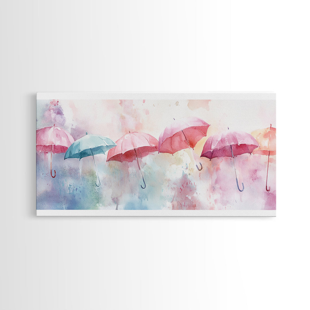 Pastel Umbrellas Canvas Print | Whimsical Watercolor Wall Art | Cottagecore Colorful Decor | Feminine Bedroom Artwork | Light Pink Wall Art