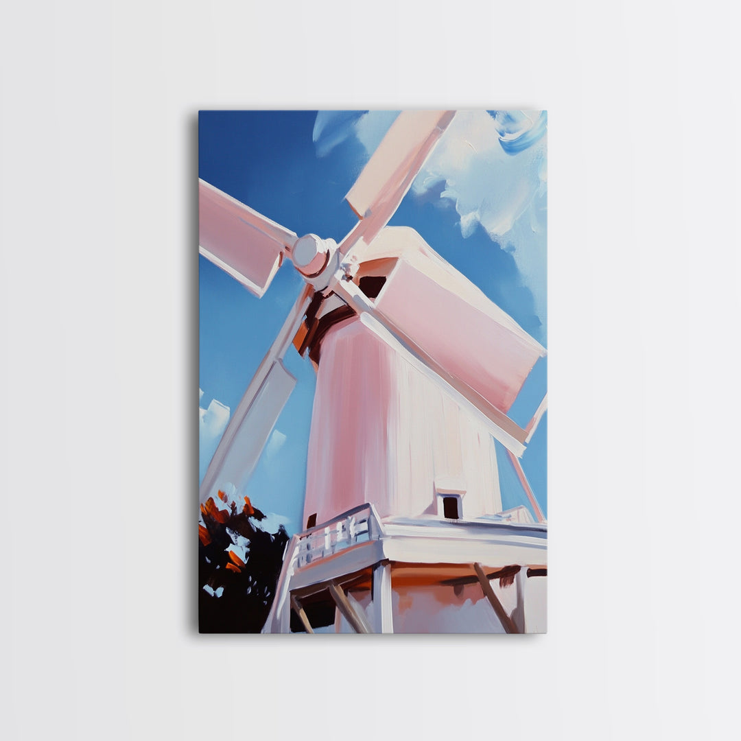 Pastel Windmill Painting, Rustic Farmhouse Wall Art, Soft Blue Sky Scene, Framed Canvas Print, Minimalist Vintage Decor, Boho Home Aesthetic