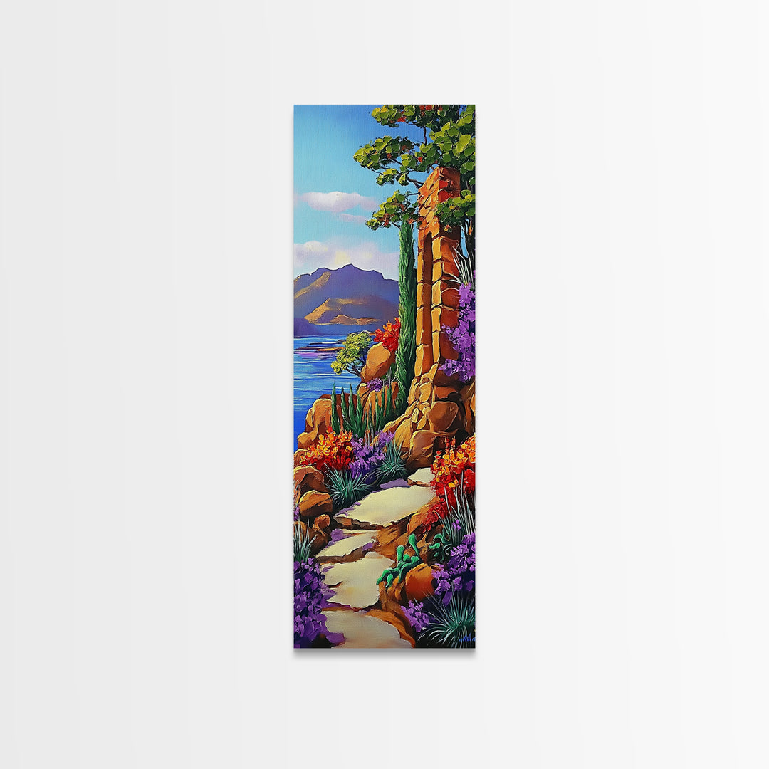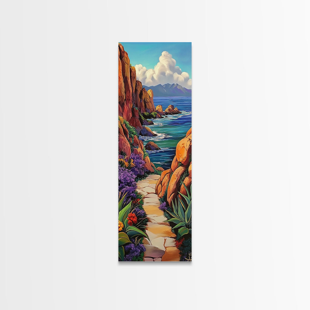 Path Cliffs, Ocean Nature, Framed Canvas Print, Vibrant coastal trail art, colorful nature decor, hallway or bedroom wall print