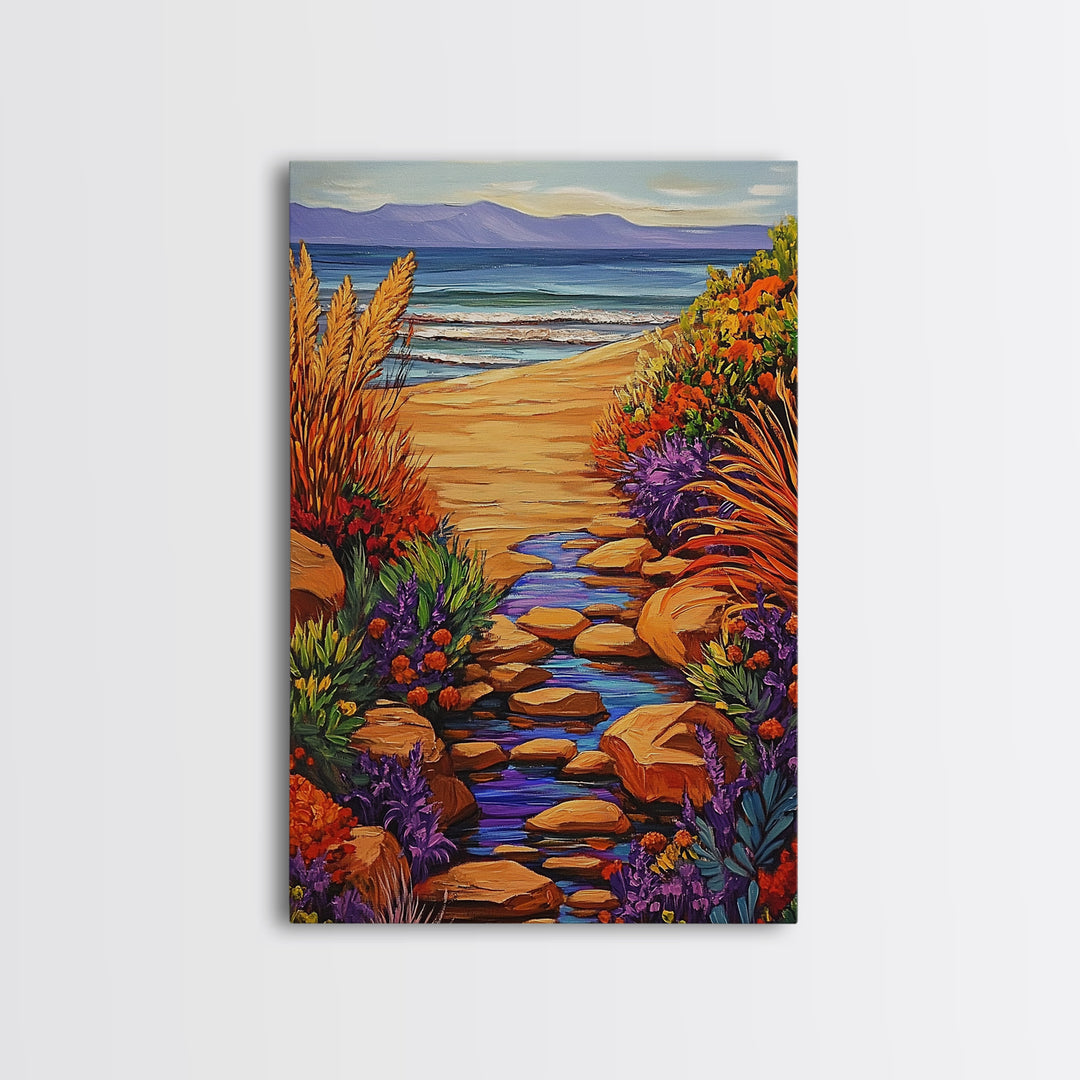 Path Ocean, Flowers, Shoreline, Framed Canvas Print, Bright coastal landscape, colorful wildflower path, Bathroom or Entryway Wall Art